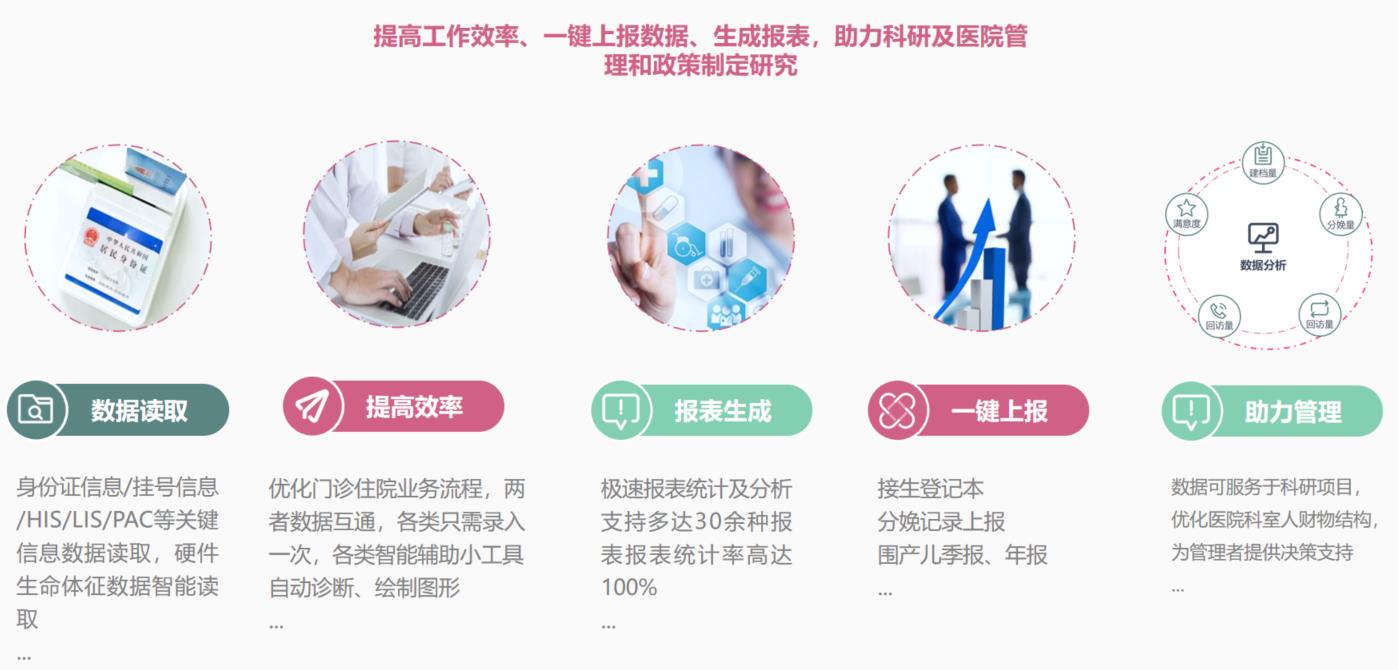 數字化產科管理平臺(智慧產科管理系統)是為醫院產科量身定制的信息管理系統。它管理了孕婦從懷孕開始到生產結束42天以內的一系列醫院保健服務信息。該系統由門診系統、住院系統、數據統計模塊三部分組成,與醫院HIS/LIS/PACS/RIS等系統進行對接,完成數據的自動提取集成和分析。支持相關數據的上報省市婦幼平臺,減輕醫務人員工作量,系統集成孕婦門診,住院和出院隨訪三個階段信息,構建并打造出的一套完善的孕產婦保健信息化管理平臺。
